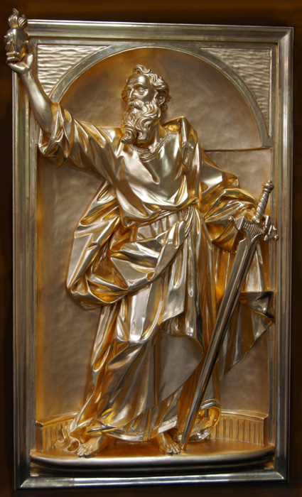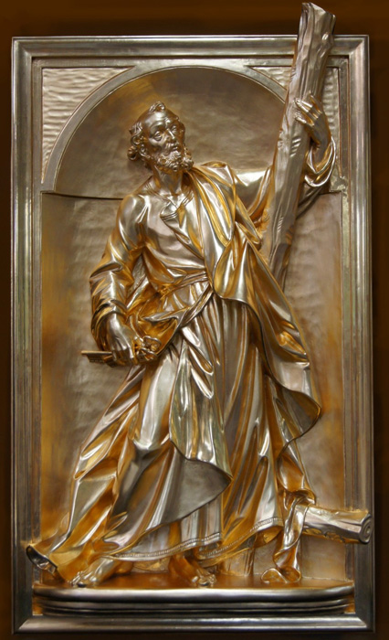 Vergoldung der drei aus Lindenholz geschnitzten Reliefs mit den Figuren des Hl. Petrus, des Hl. Paulus und der Verkündigung an Maria.